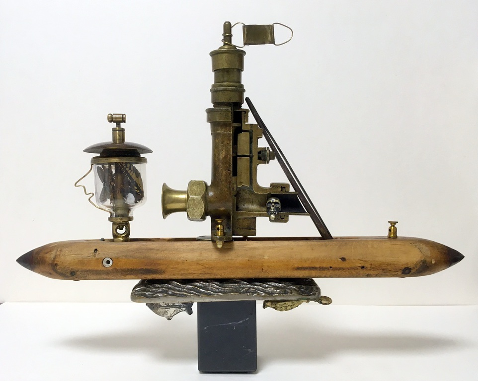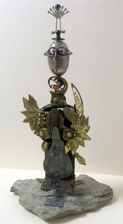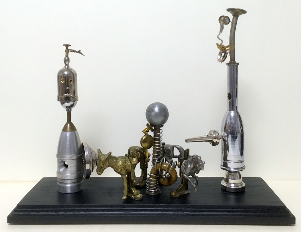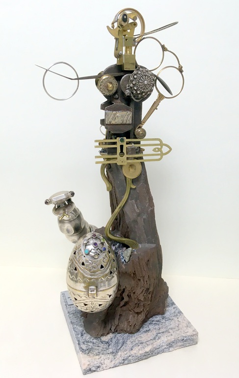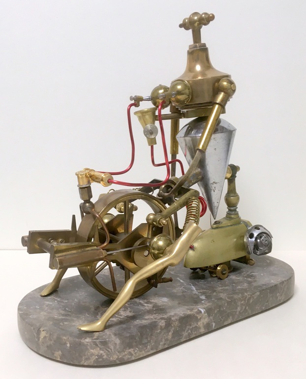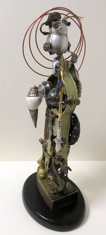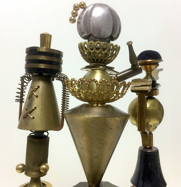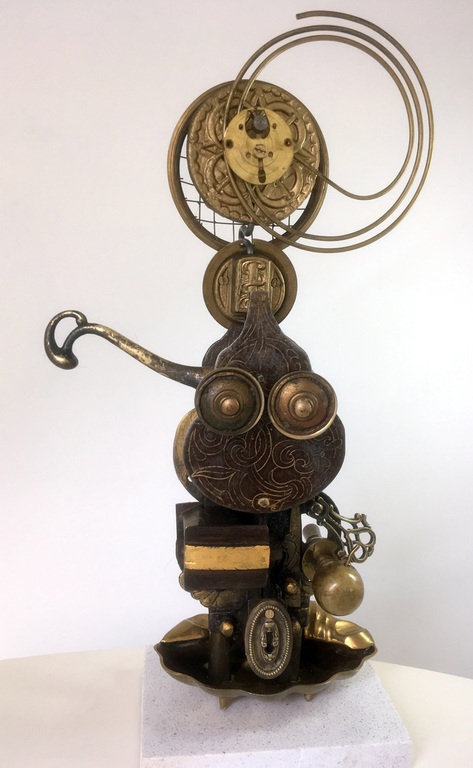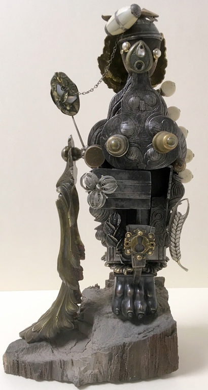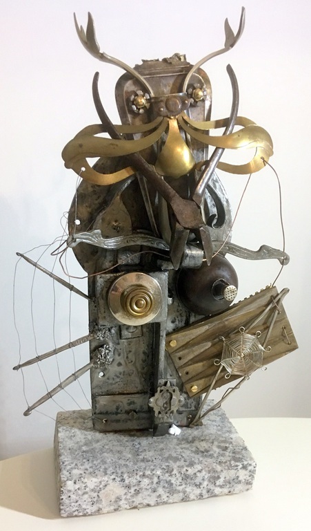 Antique technical objects and items are assembled into unsusual, unique object figures. Upcycling art has been produced that opened up a completely new contexts of meaning, giving free rein to the viewer's imagination. Each part of a figure already has its very own story and now, as a complete figure, tells a new story in a contemporary context. An old padlock with a hidden signature completes the figure.