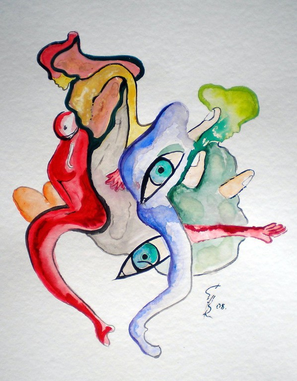 Durch gezielte und spontane Farbigkeit sowie verschiedene zeichnerische Details wirken die Bilder zerbrechlich und zerrissen, bilden aber auch eine einheitliche Komposition . Den zerbrechlichen und zerrissen Menschen in seiner Vielfalt dennoch ganzheitlich zu sehen, unterstreicht die Wahl der Titel. Den Titeln der 26 Werke sind die 26 Buchstaben des Alphabetes(in Klammern) zugeordnet.
